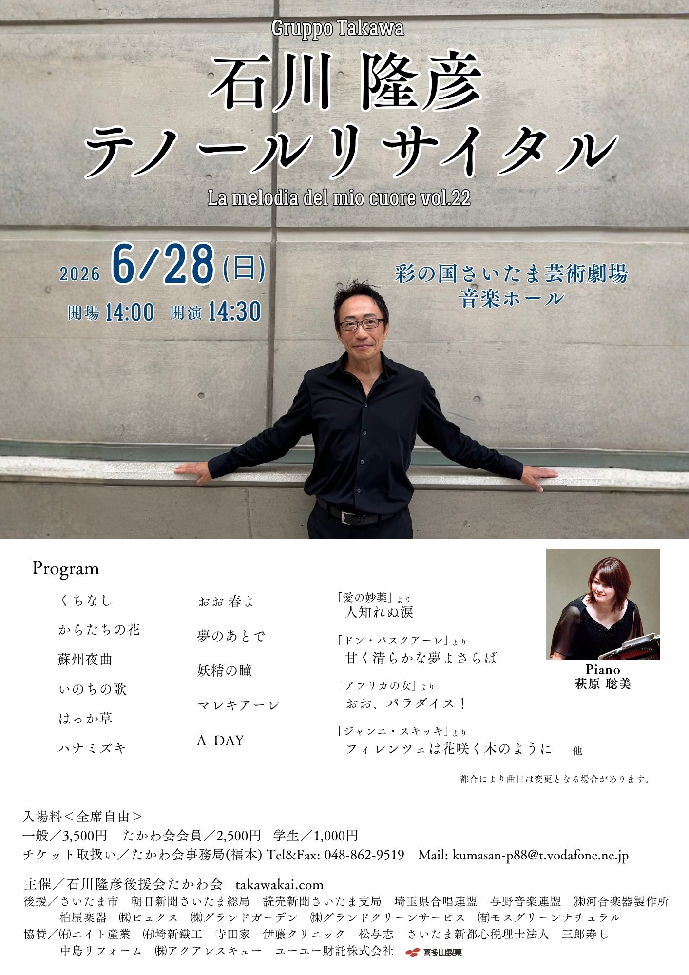 たかわ会は、テノール歌手・石川隆彦の後援会です。埼玉を中心に活動しています。 会名の由来は「たかひこ」の「輪」。石川隆彦とその音楽がつなぐ輪がいつのまにか広がって、この会が結成されました。 みんなで大きな輪になって、ともに楽しく心安らぐ時間を過ごしませんか?