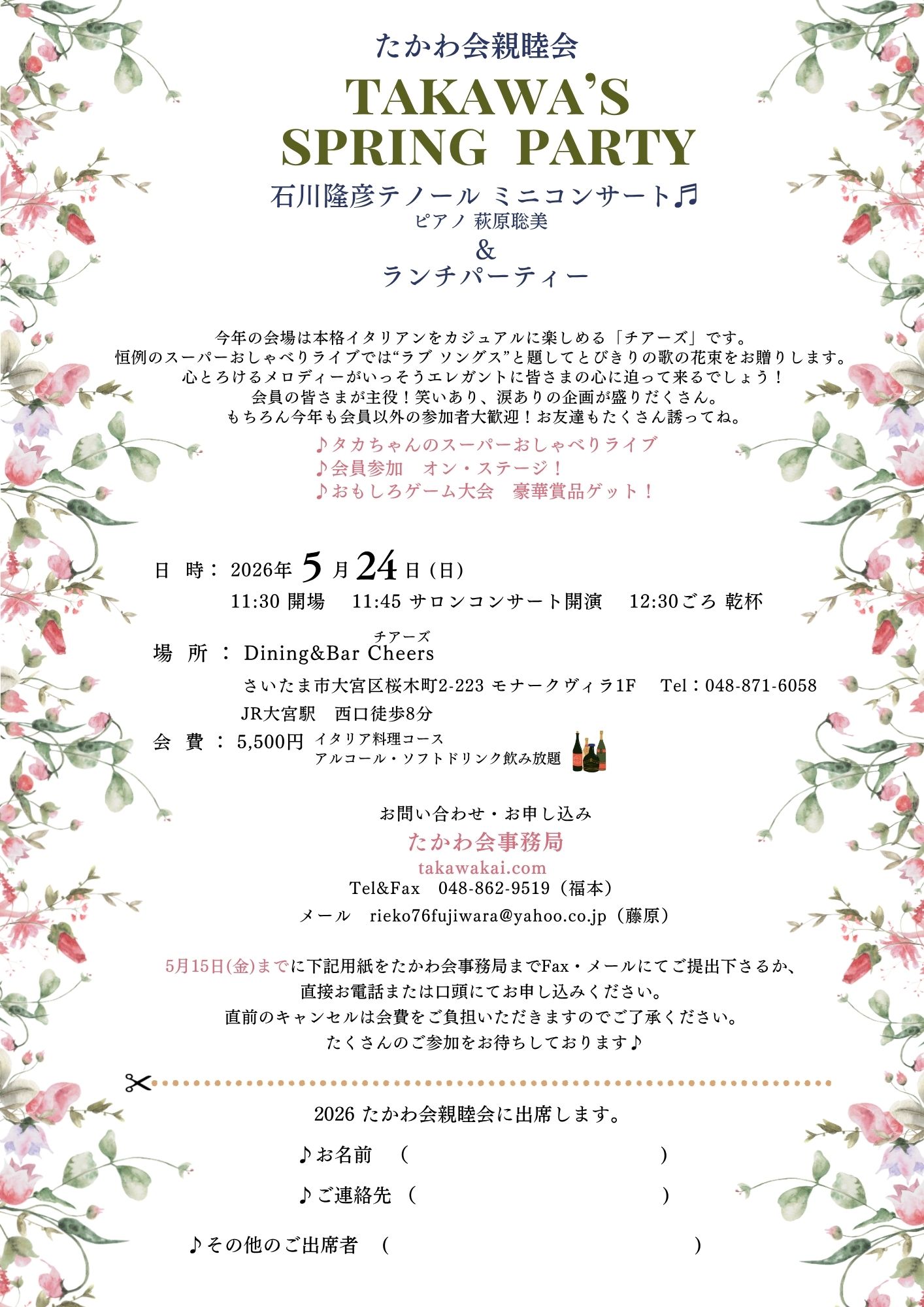 たかわ会は、テノール歌手・石川隆彦の後援会です。埼玉を中心に活動しています。 会名の由来は「たかひこ」の「輪」。石川隆彦とその音楽がつなぐ輪がいつのまにか広がって、この会が結成されました。 みんなで大きな輪になって、ともに楽しく心安らぐ時間を過ごしませんか?