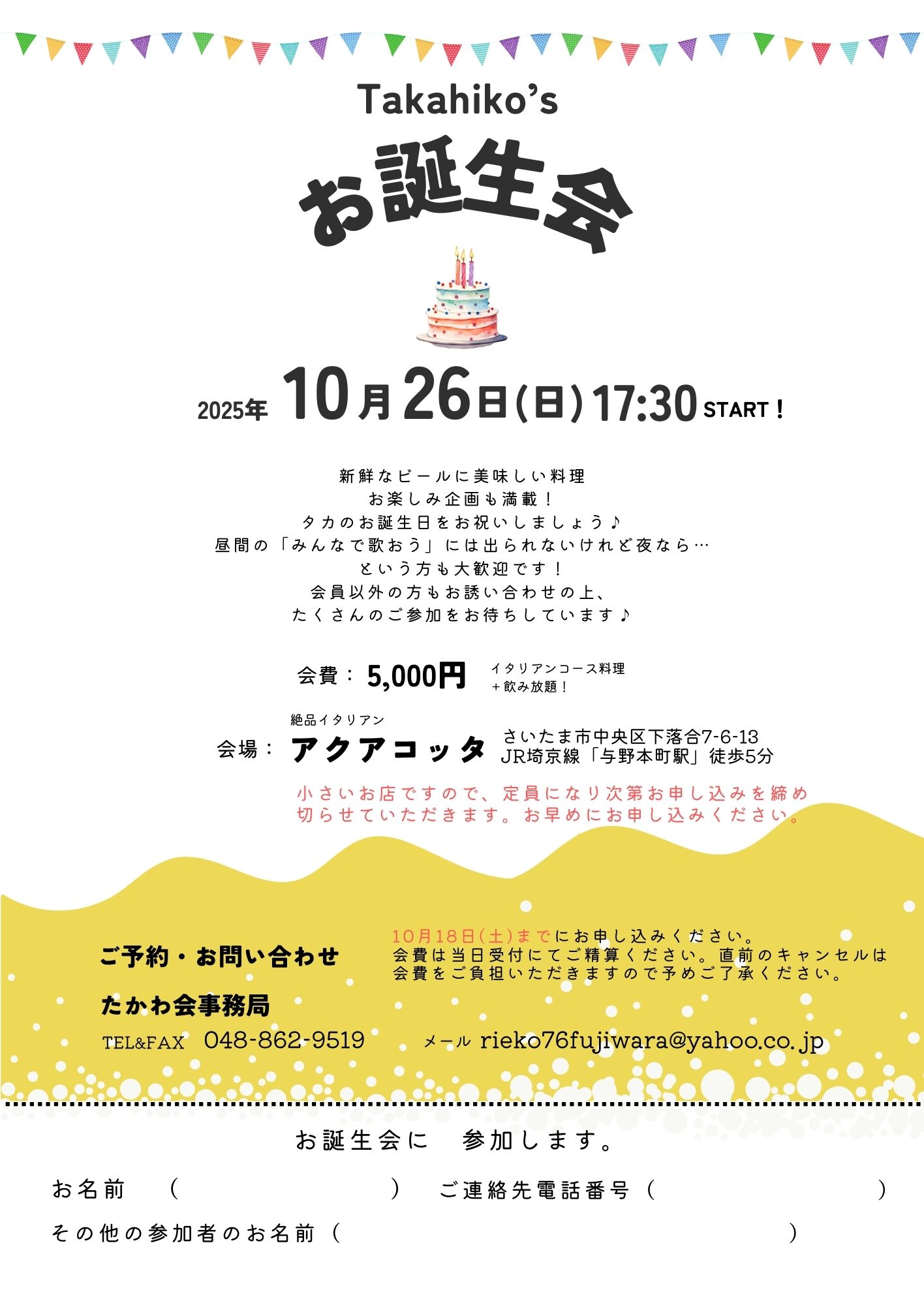 たかわ会は、テノール歌手・石川隆彦の後援会です。埼玉を中心に活動しています。 会名の由来は「たかひこ」の「輪」。石川隆彦とその音楽がつなぐ輪がいつのまにか広がって、この会が結成されました。 みんなで大きな輪になって、ともに楽しく心安らぐ時間を過ごしませんか?