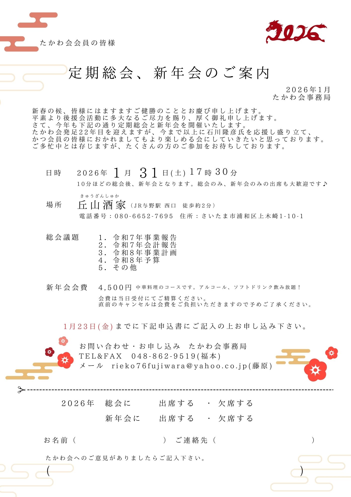 今年もたかわ会の総会・新年会を開催いたします。 たくさんのご参加をお待ちしています♪